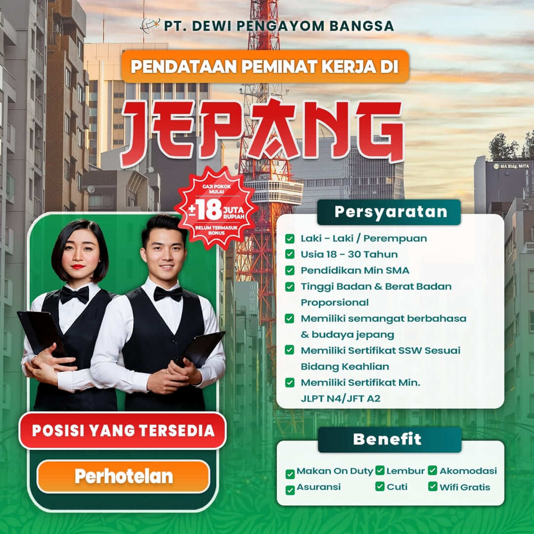 - Pandai Kaiwa (diutamakan bisa baca & menulis huruf Jepang)